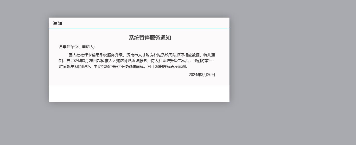 為避免系統(tǒng)維護(hù)升級員工無法提報,本次濟(jì)南市高層次人才購房補(bǔ)貼申請受理時間為2024年5月1日-2024年5月8日周一至周五(節(jié)假日除外、周末除外)上午9:00-11:00,下午13:00-16:00,符合條件人員統(tǒng)一通過申報系統(tǒng)報送資料至邦得。同時,24.03.26開始系統(tǒng)調(diào)試無法申報,請見第1附件。如果系統(tǒng)調(diào)試沒有恢復(fù),無法申報該補(bǔ)貼。
